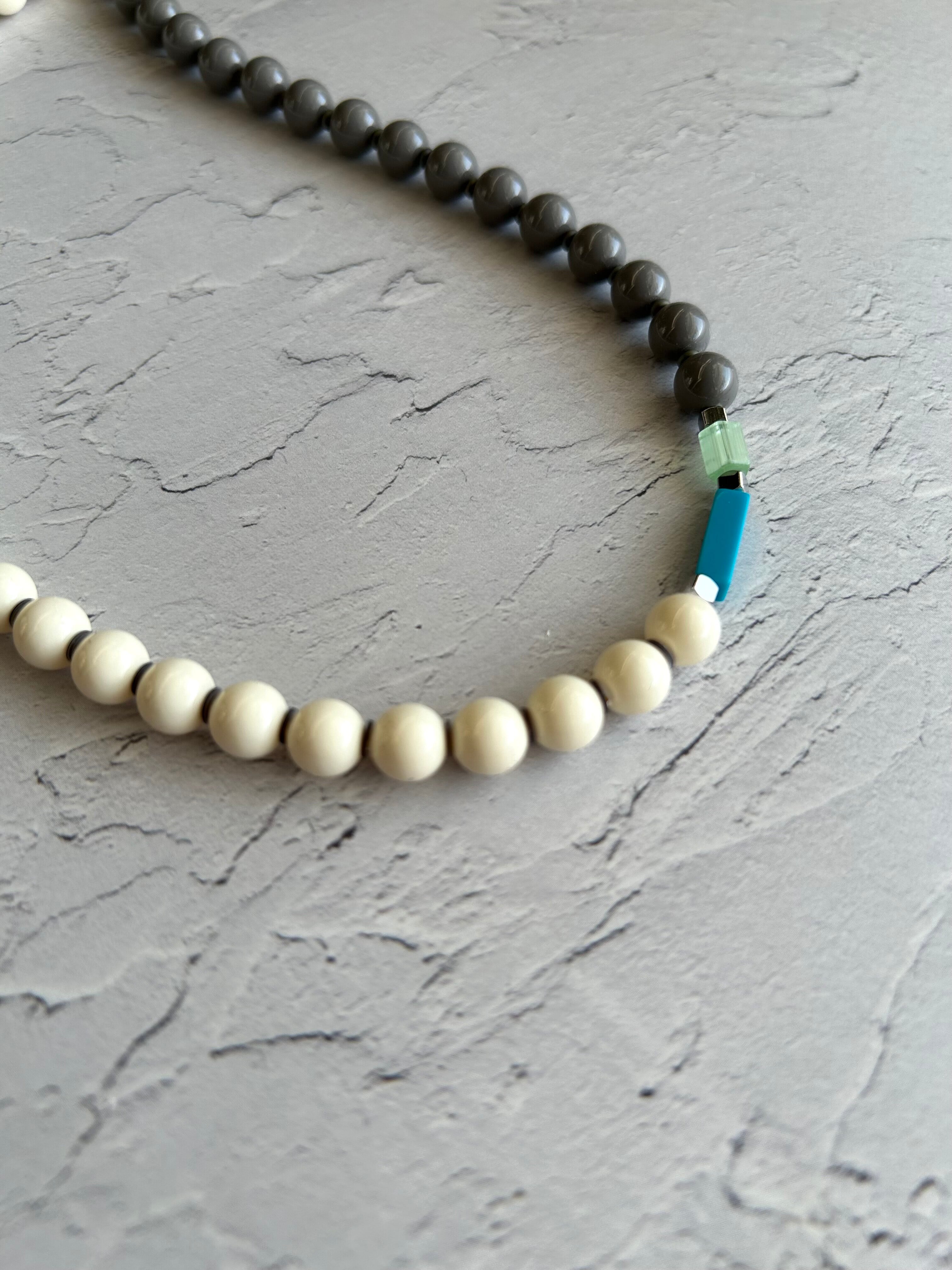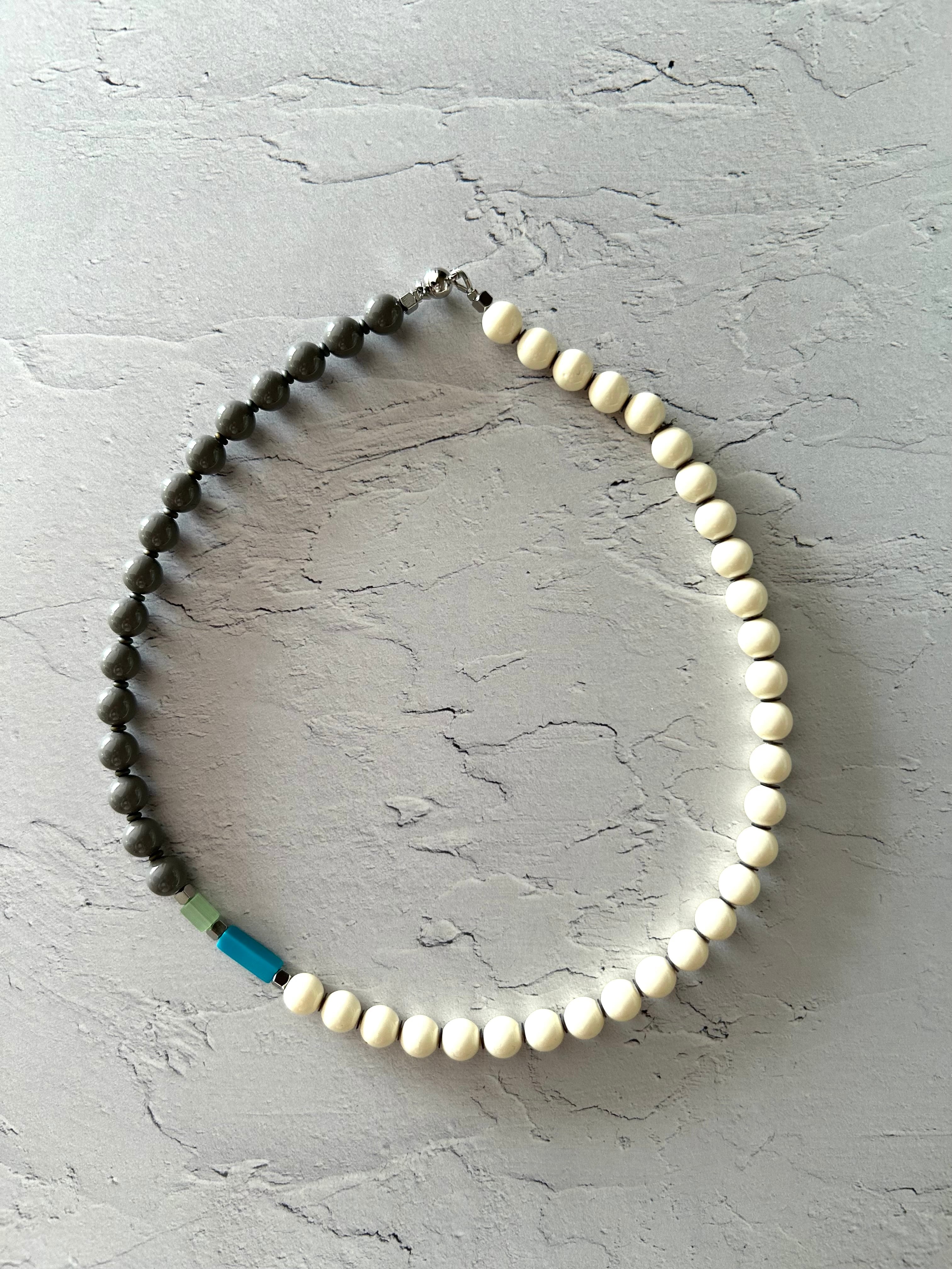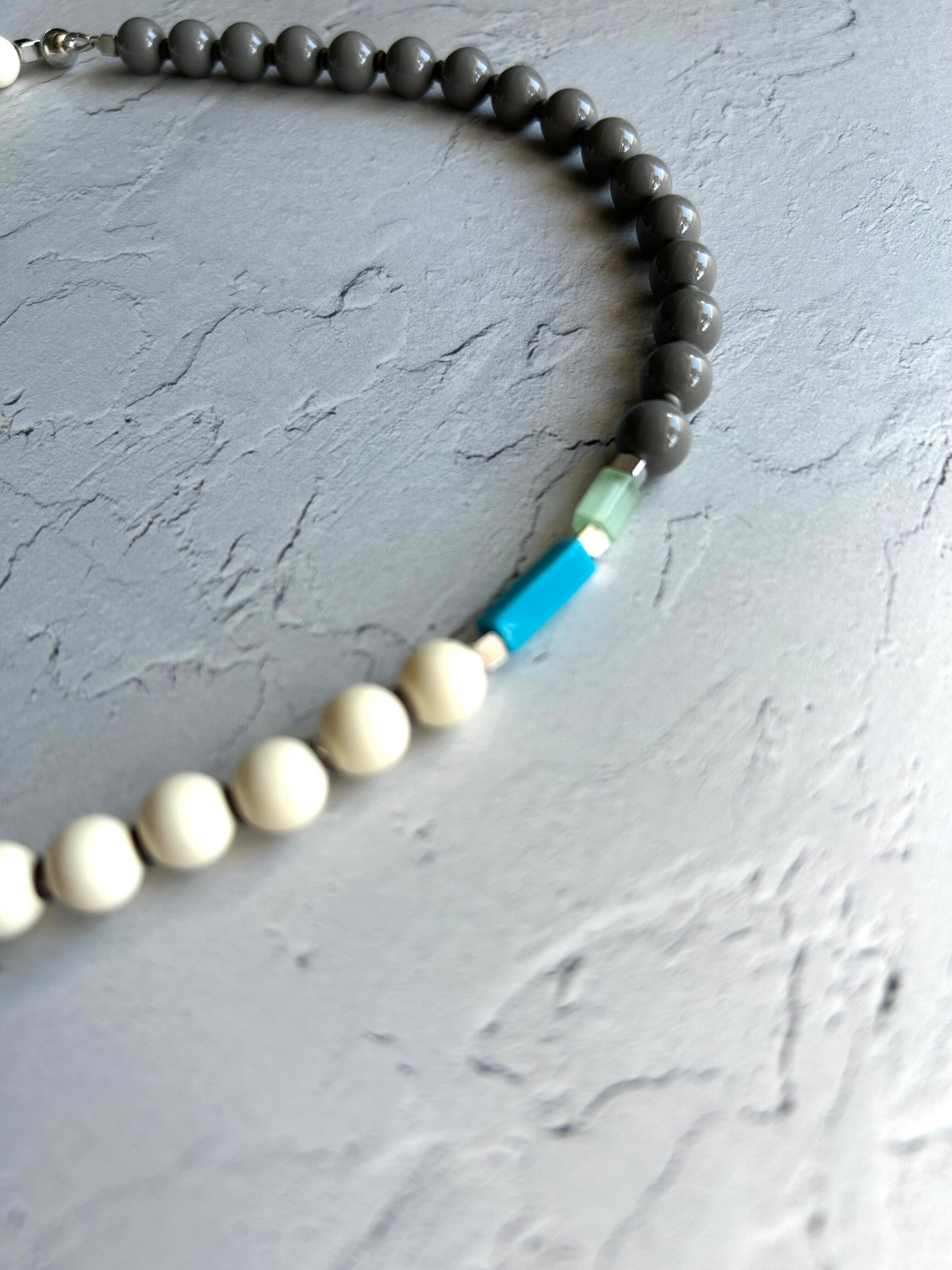 ミルキーホワイトとグレートーンをベースに、ターコイズをアクセントに配置